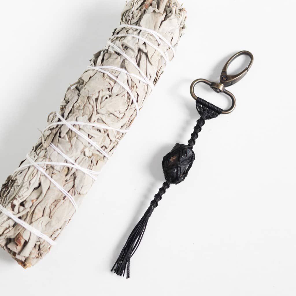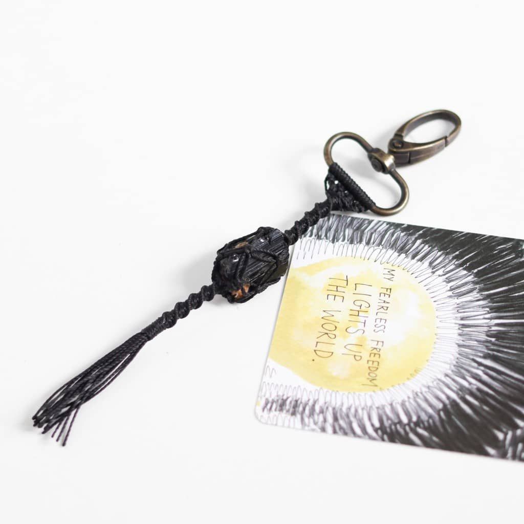 - Móc khóa bảo vệ với đá thô Black tourmaline tự nhiên được làm thủ công theo kiểu dáng macrame. Black tourmaline là viên đá mang đến sự bảo vệ rất tốt, năng lượng tích cực cho người đeo và sử dụng.