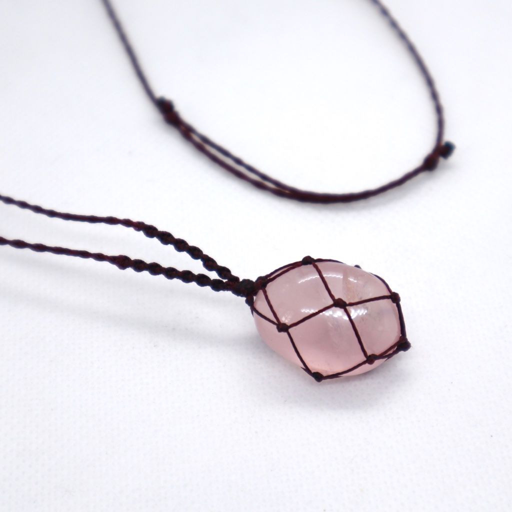 - Vòng cổ với đá Thạch anh hồng rose quartz tự nhiên được làm thủ công theo kiểu dáng macrame. Thạch anh hồng là viên đá mang đến năng lượng tình yêu, hạnh phúc cho người đeo và sử dụng.