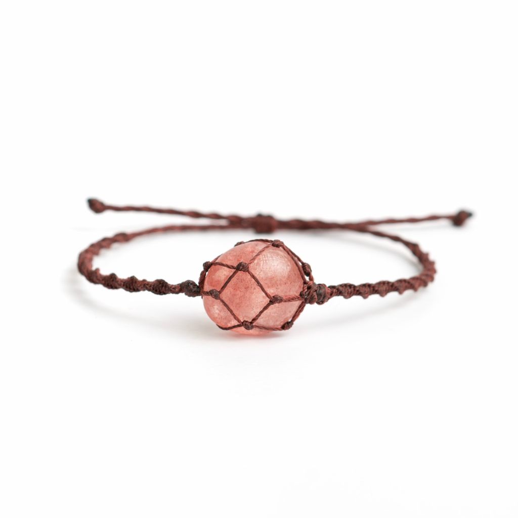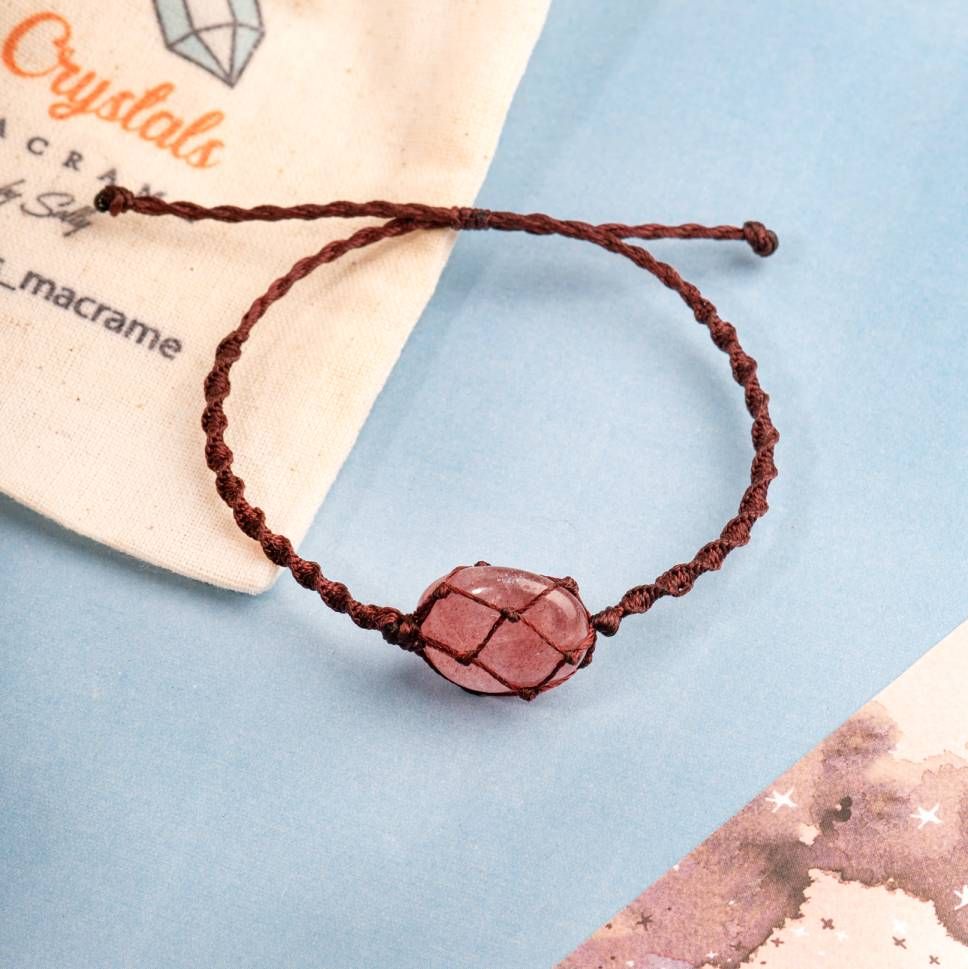 - Vòng tay với đá thạch anh dâu tây được làm thủ công theo kiểu dáng macrame. Thạch anh dâu tây là viên đá mang đến năng lượng tích cưc và xua đuổi tà khí như thạch anh trắng, đồng thời bổ sung tình yêu, mang lại sự thấu hiểu mục đích và nắm bắt cảm xúc.