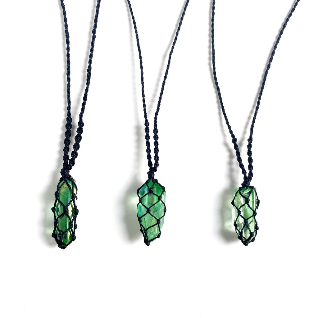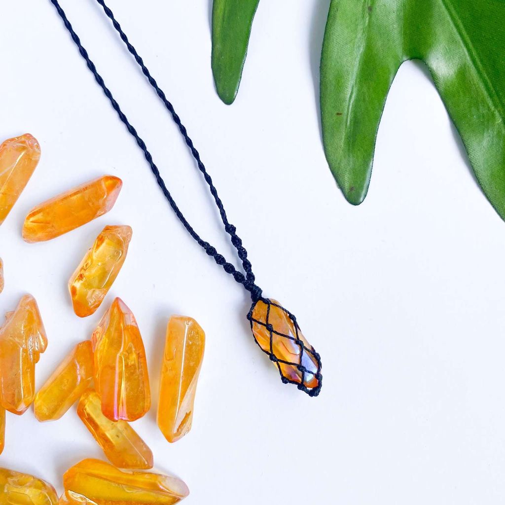 - Vòng cổ với đá thạch anh hào quang được làm thủ công theo kiểu dáng macrame. Thạch anh hào quang là viên đá mang đến năng lượng vui vẻ, tình yêu và yên bình cho người đeo và sử dụng. Đá thạch anh aura là đá tự nhiên được lên màu luyện kim nhân tạo một lớp ở ngoài để có màu sắc hào quang lấp lánh.