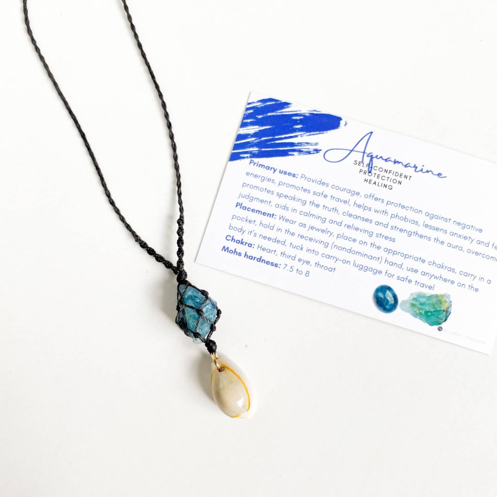 - Vòng cổ với đá aquamarine thô tự nhiên được làm thủ công theo kiểu dáng macrame. Aquamrine là viên đá mang đến sự tự tin, năng lượng bảo vệ và an tâm cho người đeo.