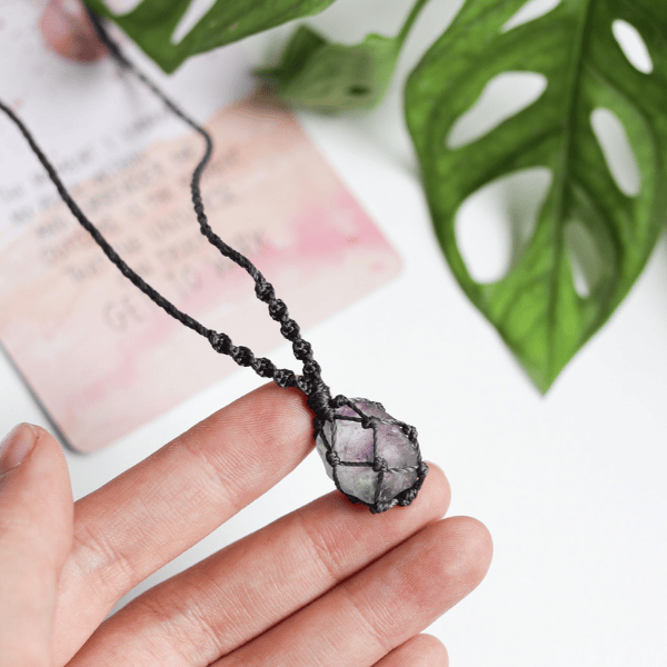 - Vòng cổ với đá Flourite tự nhiên được làm thủ công theo kiểu dáng macrame. Flourite cầu vồng là viên đá có nhiều màu sắc, mang đến năng lượng bình an, kết nối cho người đeo.