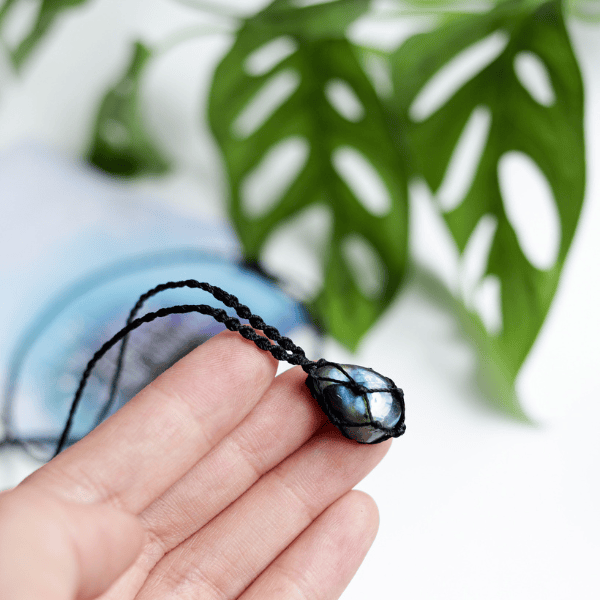 - Vòng cổ với đá xà cừ tự nhiên được làm thủ công theo kiểu dáng macrame. Xà cừ, hay còn gọi là hắc nguyệt quang là viên đá mang đến năng lượng sáng tạo, khơi thông tâm trí cho người đeo.