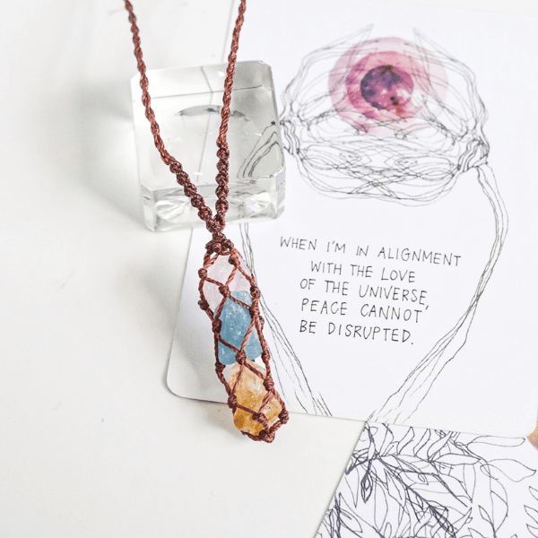 - Vòng cổ kết hợp 3 đá mang năng lượng may mắn và tình yêu được kết hợp bởi 3 đá : Thạch anh vàng, aquamarine, thạch anh hồng. Vòng tay macrame với đá tự nhiên được làm thủ công bởi Crystals Macrame.