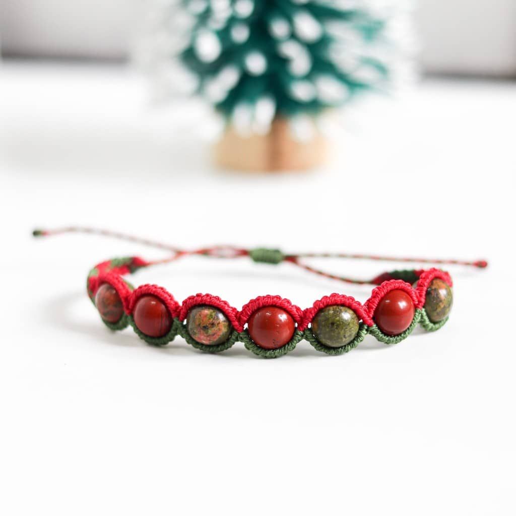 - Vòng tay Giáng Sinh đá Red Jasper và Unakite được lấy cảm hứng từ màu sắc chủ đạo của Giáng SInh là đỏ và xanh lá. Vòng tay là sự kết hợp giữa hai loại đá jasper. Đá jasper có nhiều màu sắc khác nhau và đều có năng lượng hộ mệnh tốt, trong đó jasper đỏ giúp tăng thêm đam mê và jasper unakite mang đến sự bình tĩnh và hài hòa.