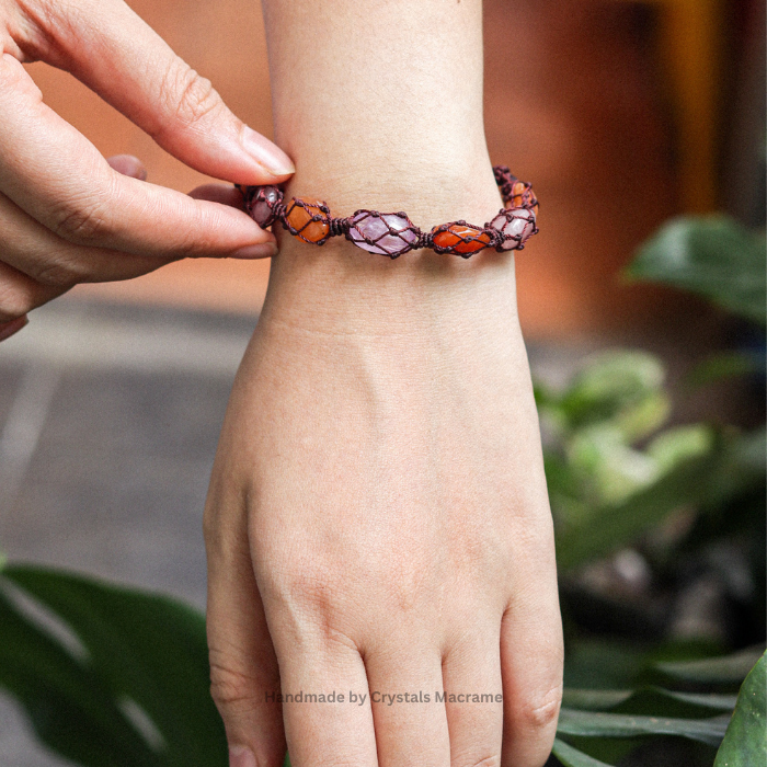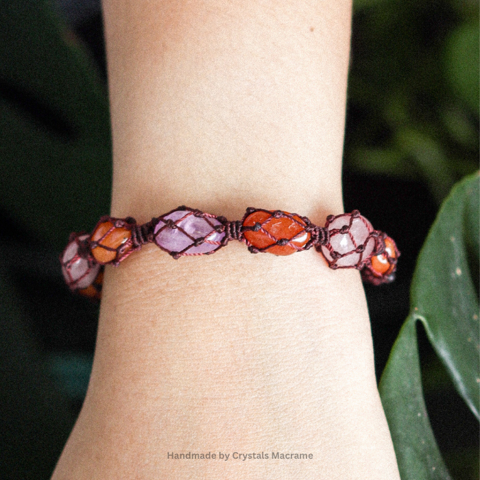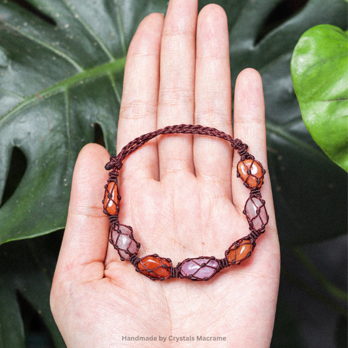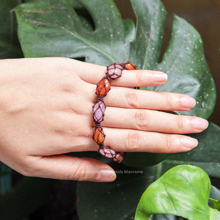 Sản phẩm vòng macrame được làm từ các viên đá tự nhiên, mỗi viên đều mang nét độc đáo riêng. Dây macrame được thắt thủ công tỉ mỉ, sử dụng chỉ Linhasita chất lượng cao nhập trực tiếp từ Brazil, dòng dây chuyên để làm trang sức macrame ở nước ngoài. Mỗi viên đá tự nhiên được chọn lọc kỹ càng để đảm bảo chất lượng cao và sự thăng hoa của màu sắc tự nhiên.