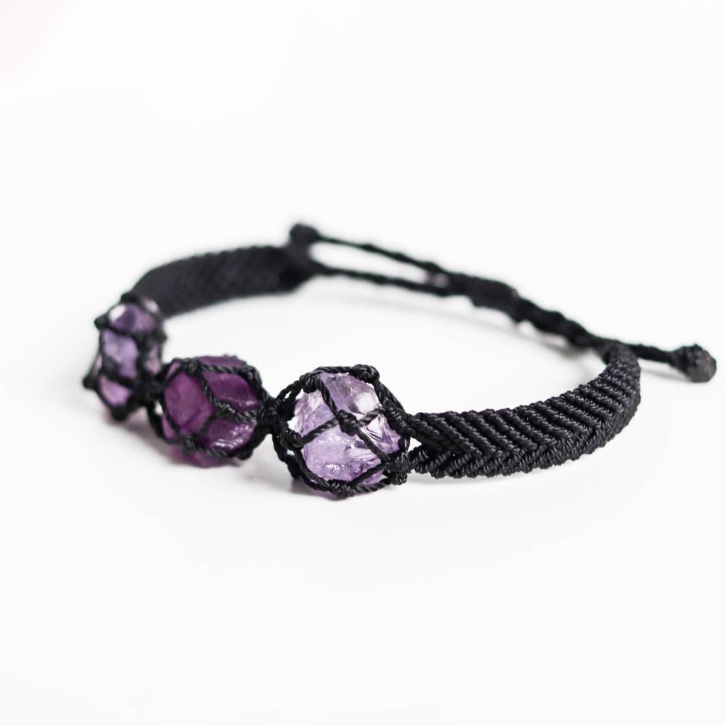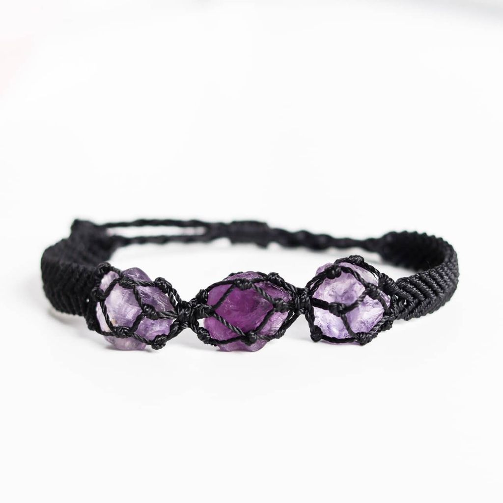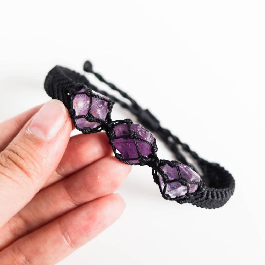 - Vòng tay unisex được làm từ 3 viên đá thạch anh tím, thắt dây thủ công theo kiểu dáng macrame. Thạch anh tím hay còn gọi là amethyst, là viên đá mang đến năng lượng bảo vệ và cảm giác yên bình cho người đeo. Ngoài ra, amethyst còn có công dụng làm dịu tinh thần, giúp ngủ ngon.